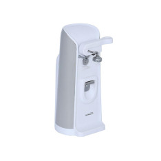 Save space in your kitchen with the smartly designed 3 in 1 Brentwood J-30W Tall Electric Can Opener with Knife Sharpener & Bottle Opener. Our tall can opener has auto pierce and shut off, capable of opening any size can on the first try. Easily remove the one touch lever for cleaning. Use the manual ceramic knife sharpener to sharpen plain edge knives. Cord stores in the base for stress free storage. Stylish 2 tone white and grey color looks great in every kitchen.
